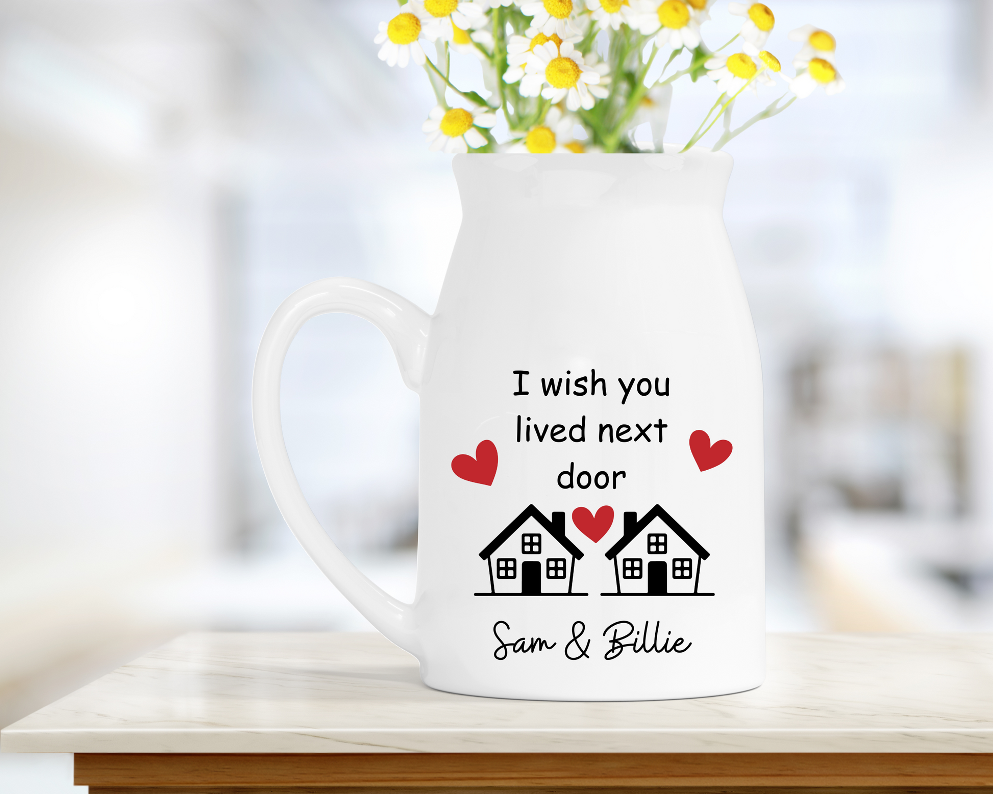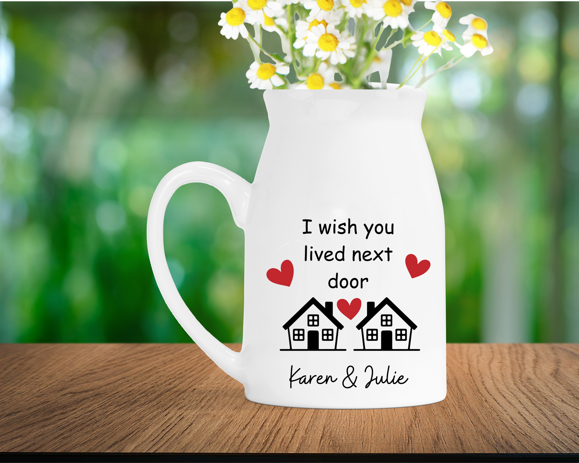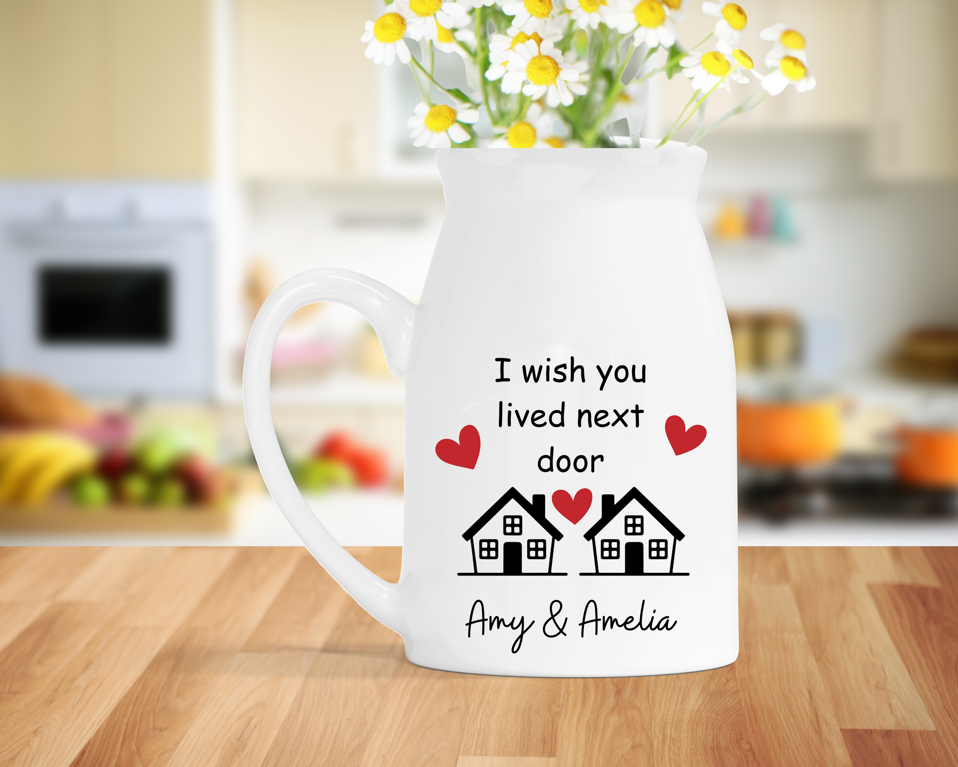 Make a heartfelt statement with our Personalised Friendship Milk Jug Vase – “Wish You Lived Next Door” Design — a charming and thoughtful keepsake that celebrates friendship, laughter, and the bonds that distance can’t break. Perfect for best friends, long-distance friendships, or neighbours you wish were closer.